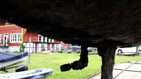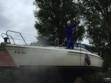 In 2015 schlugen wir dann ohne großes Nachdenken zu, als eine Maxi Fenix aus Alters- bzw. Gesundheitsgründen zu verkaufen war. Nun ja, der Zustand war, gelinde gesagt, recht pflegebedürftig. Vier Jahre Sonne, Regen, Wind, Wetter und flaches Süßwasser am Liegeplatz haben kräftig gewirkt. Dazu war das Boot innen noch orginal in dem Zustand, wie der Eigner es verlassen hat. Geringstes Problem war dabei noch, dass er passionierter Pfeiffenraucher war und wir Nichtraucher sind. Mit ein wenig Putzmittel und Pinsel war da nichts mehr zu machen. Die nächste Überraschung erwartete uns beim Anblick des Unterschiffes - woher in aller Welt kommen die ganzen Muscheln, was ist das für ein eigenartiger, kaum sich ablösender Schleim und was sind das für Blasen, die nach Essig riechen?